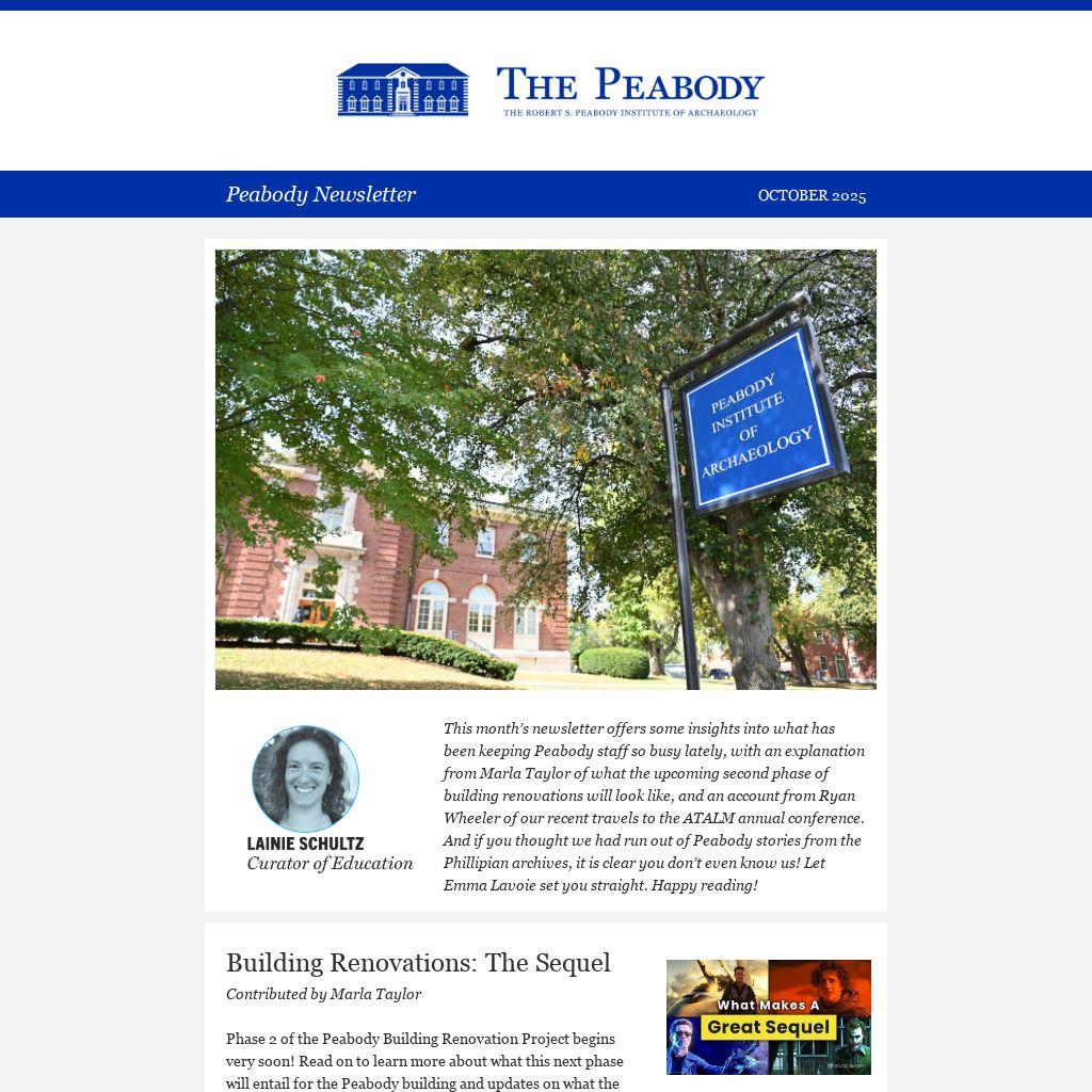 This month’s newsletter offers some insights into what has been keeping Peabody staff so busy lately, with an explanation from Marla Taylor of what the upcoming second phase of building renovations will look like, and an account from Ryan Wheeler of our recent travels to the ATALM annual conference. And if you thought we had run out of Peabody stories from the Phillipian archives, it is clear you don’t even know us! Let Emma Lavoie set you straight. Happy reading!