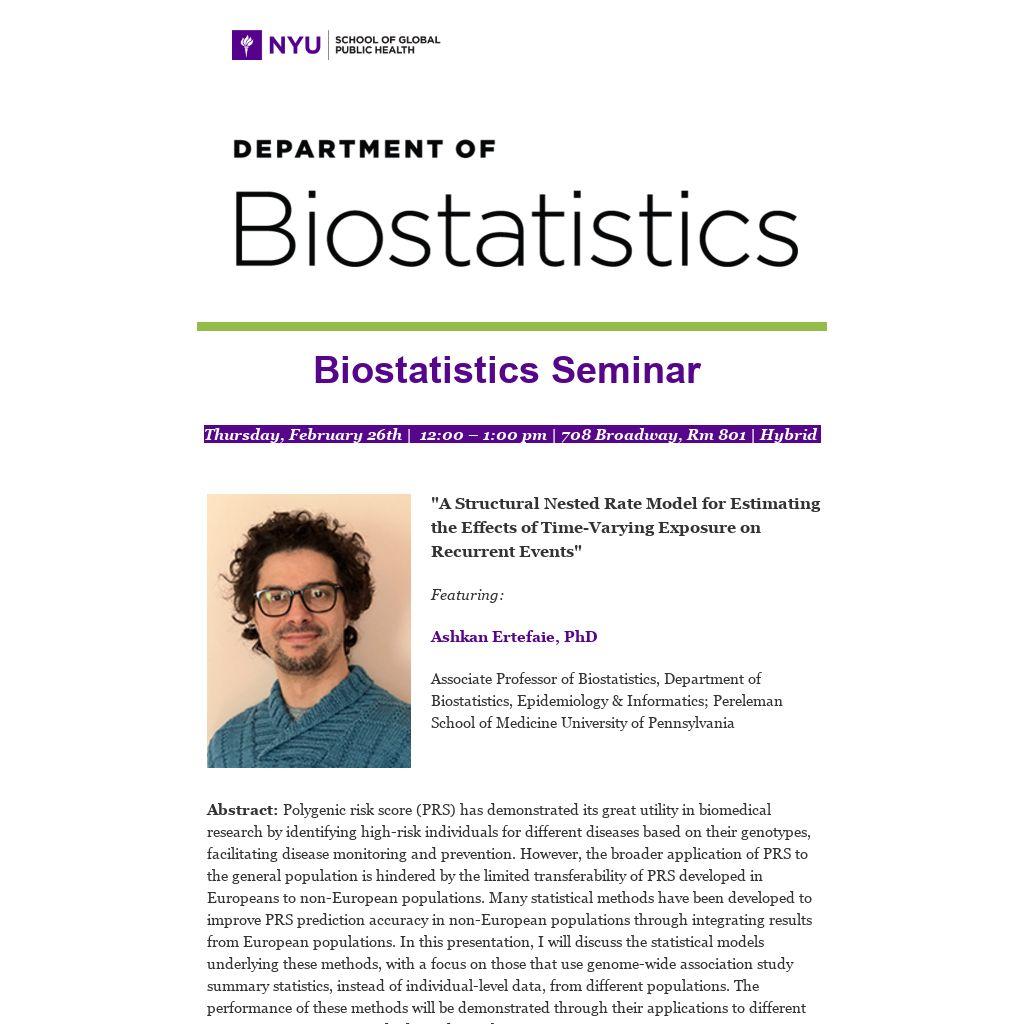 Bio: Dr. Ertefaie's research endeavors revolve around the overarching theme of developing robust and efficient methodologies, aiming to minimize reliance on restrictive modeling assumptions. At the core of his interest is the development of methods that seamlessly integrate machine learning, ensuring data-adaptive approaches while upholding the principles of valid statistical inference. His specific research area includes causal inference, individualized treatment strategies, instrumental variable analyses, high-dimensional data analysis, post-selection inference, and survival analysis.