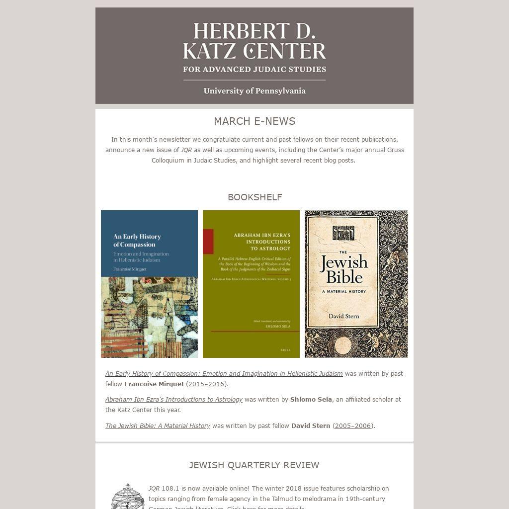 In this month’s newsletter we congratulate current and past fellows on their recent publications, announce a new issue of JQR as well as upcoming events, including the Center’s major annual Gruss Colloquium in Judaic Studies, and highlight several recent blog posts.