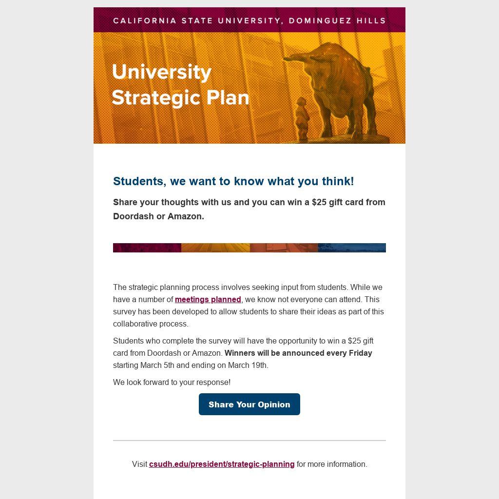 Students who complete the survey will have the opportunity to win a $25 gift card from Doordash or Amazon. Winners will be announced every Friday starting March 5th and ending on March 19th.