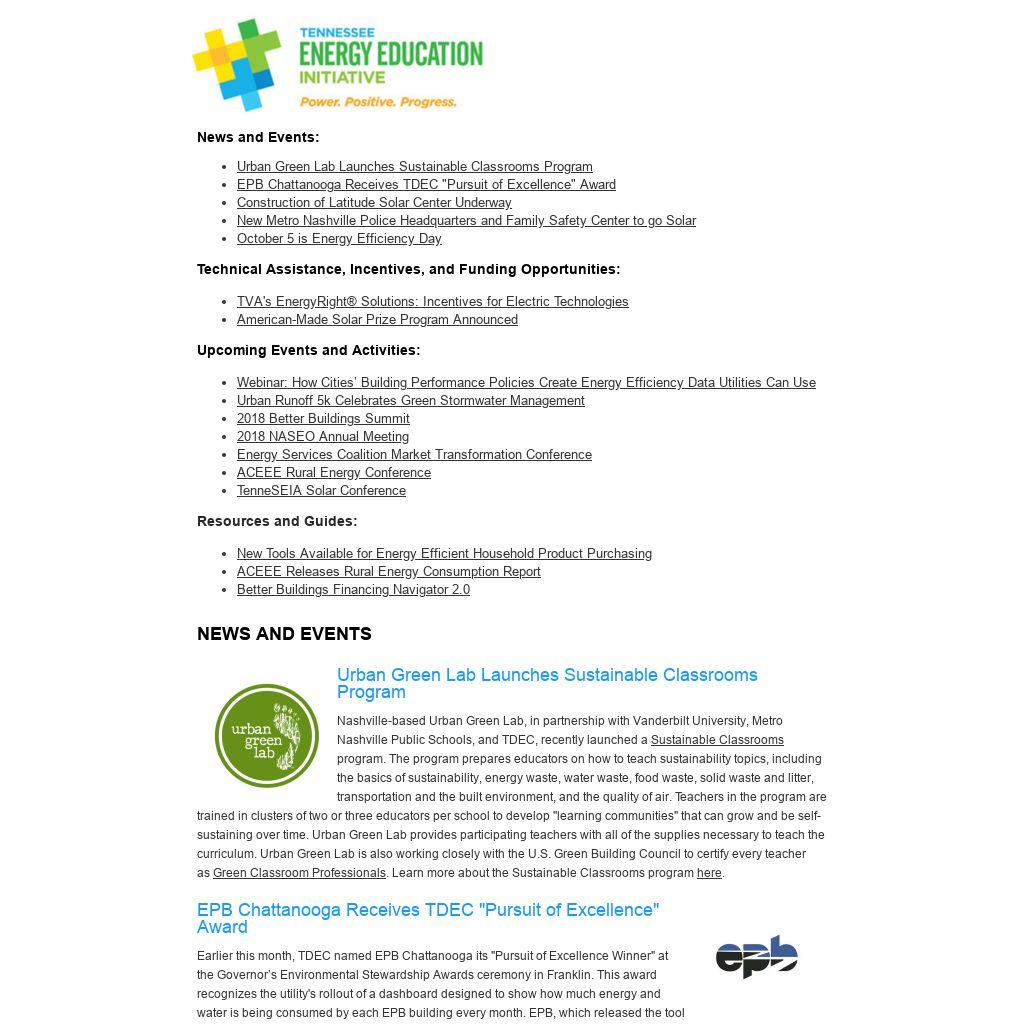 Nashville-based Urban Green Lab, in partnership with Vanderbilt University, Metro Nashville Public Schools, and TDEC, recently launched a Sustainable Classrooms program. The program prepares educators on how to teach sustainability topics, including the basics of sustainability, energy waste, water waste, food waste, solid waste and litter, transportation and the built environment, and the quality of air. Teachers in the program are trained in clusters of two or three educators per school to develop "learning communities" that can grow and be self-sustaining over time. Urban Green Lab provides participating teachers with all of the supplies necessary to teach the curriculum. Urban Green Lab is also working closely with the U.S. Green Building Council to certify every teacher as Green Classroom Professionals. Learn more about the Sustainable Classrooms program here.