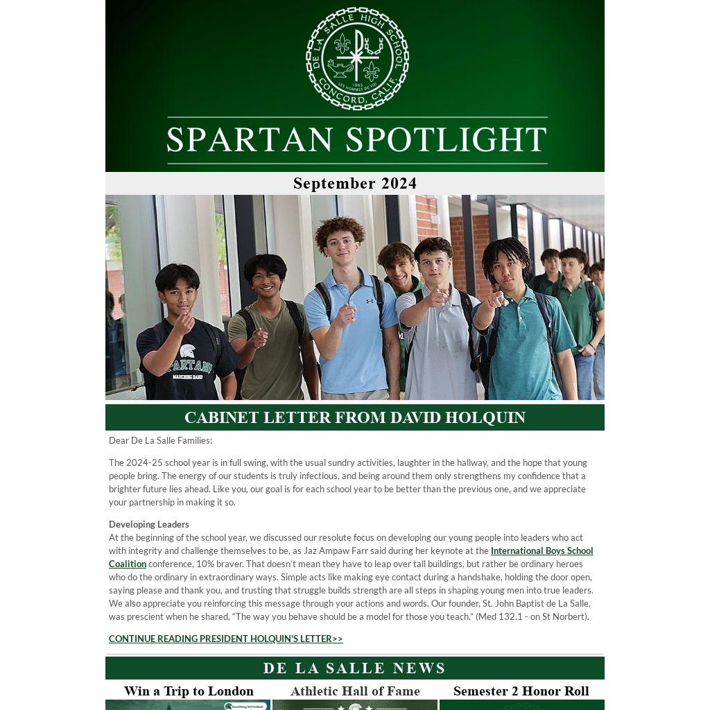 Welcome to another chapter in De La Salle Athletics. Last school year, our student-athletes continued the Spartan tradition of athletic excellence. We earned the 2023-24 EBAL All-Sports Award for the 16th consecutive year, after winning seven league titles. In addition, we won seven NCS championships and one CIF NorCal Championships. As we get fully immersed in the fall sports season, please visit our Spotlight on Athletics webpage to stay up-to-date about everything related to our sports programs.