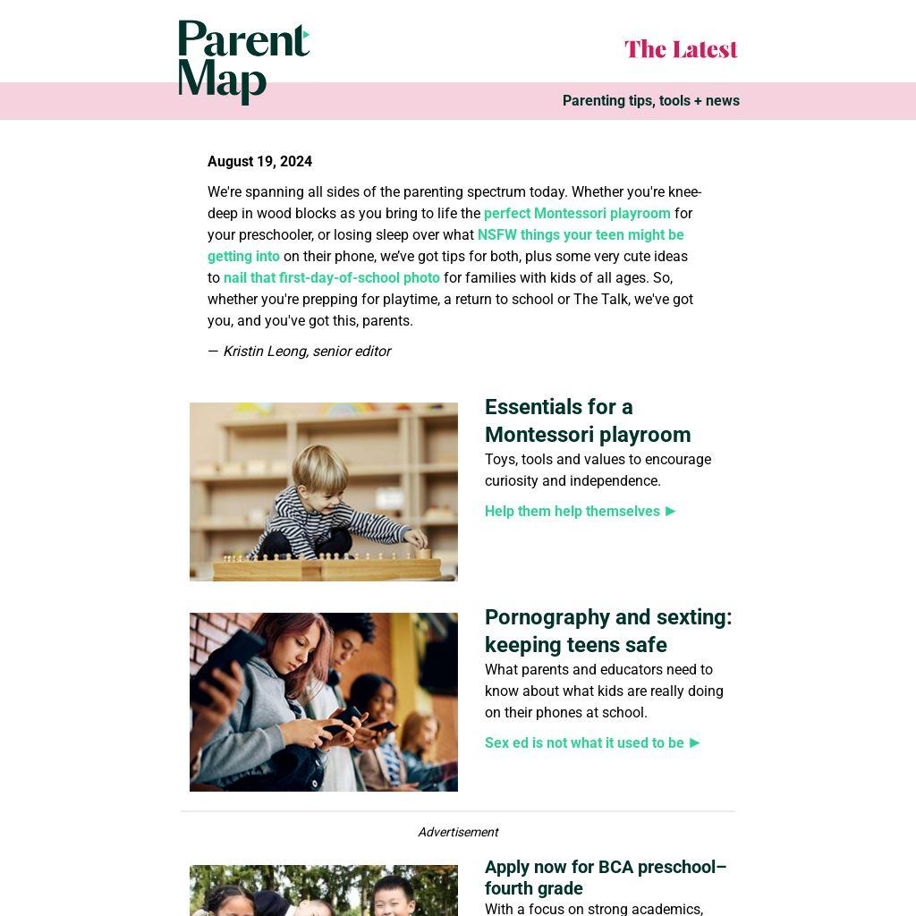 We're spanning all sides of the parenting spectrum today. Whether you're knee-deep in wood blocks as you bring to life the perfect Montessori playroom for your preschooler, or losing sleep over what NSFW things your teen might be getting into on their phone, we’ve got tips for both, plus some very cute ideas to nail that first-day-of-school photo for families with kids of all ages. So, whether you're prepping for playtime, a return to school or The Talk, we've got you, and you've got this, parents.