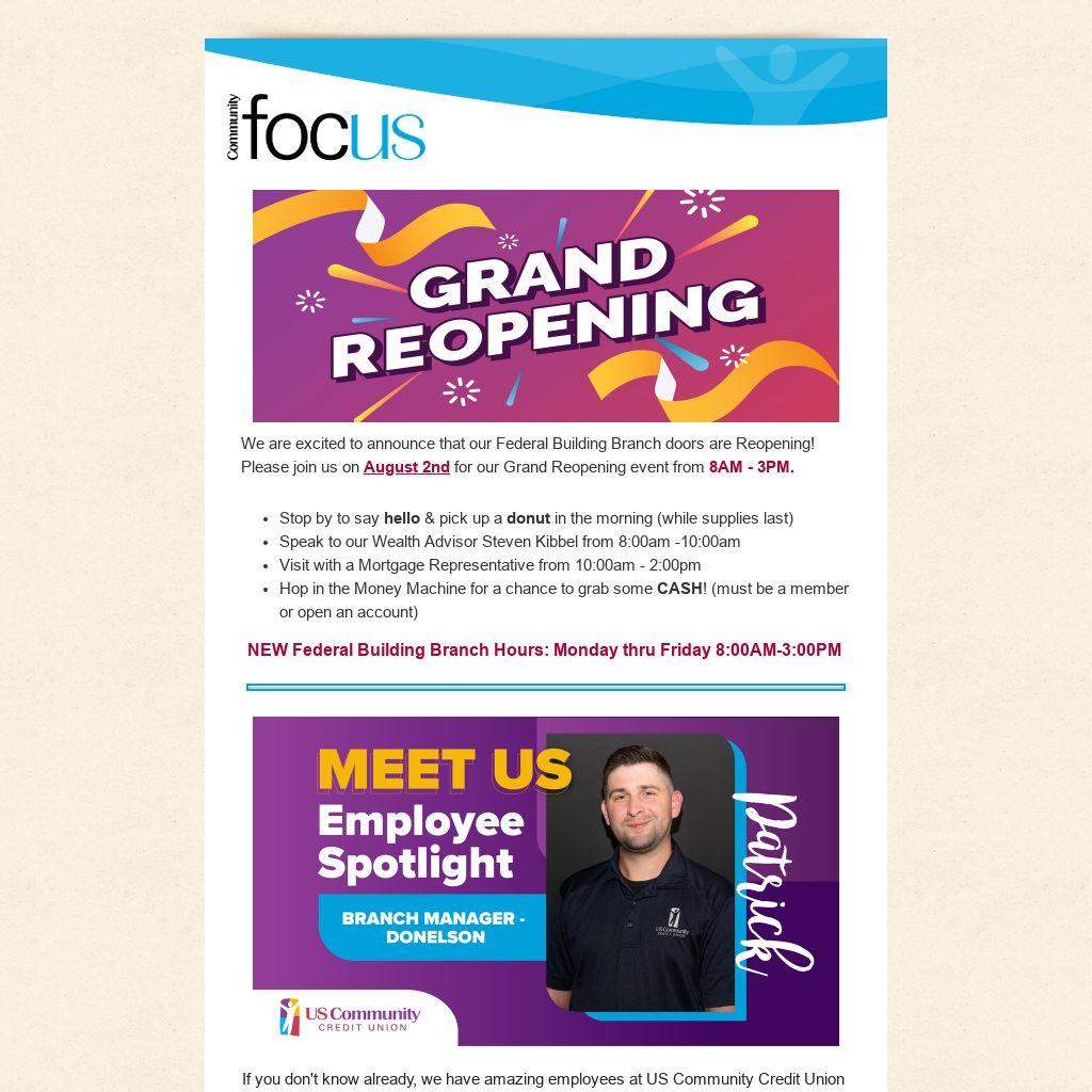 We are excited to announce that our Federal Building Branch doors are Reopening! Please join us on August 2nd for our Grand Reopening event from 8AM - 3PM.