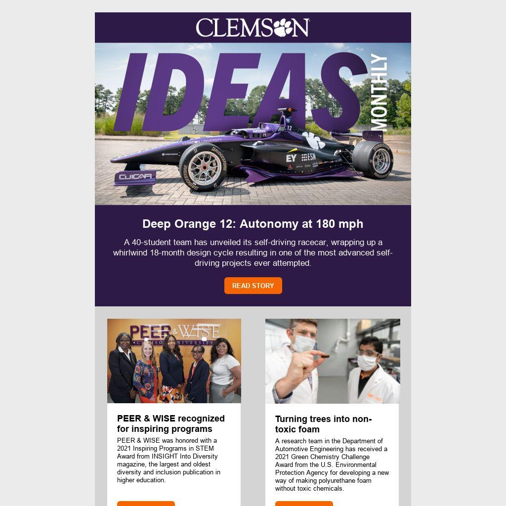 IDEAS Monthly is published by the PROMO Office in Clemson University’s College of Engineering, Computing and Applied Sciences. Contact the team with feedback or story suggestions.