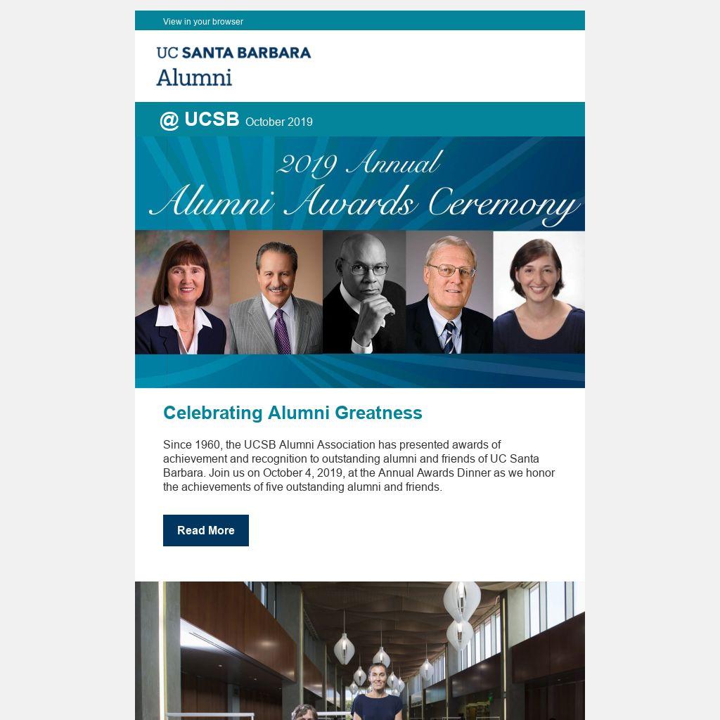 Since 1960, the UCSB Alumni Association has presented awards of achievement and recognition to outstanding alumni and friends of UC Santa Barbara. Join us on October 4, 2019, at the Annual Awards Dinner as we honor the achievements of five outstanding alumni and friends.
