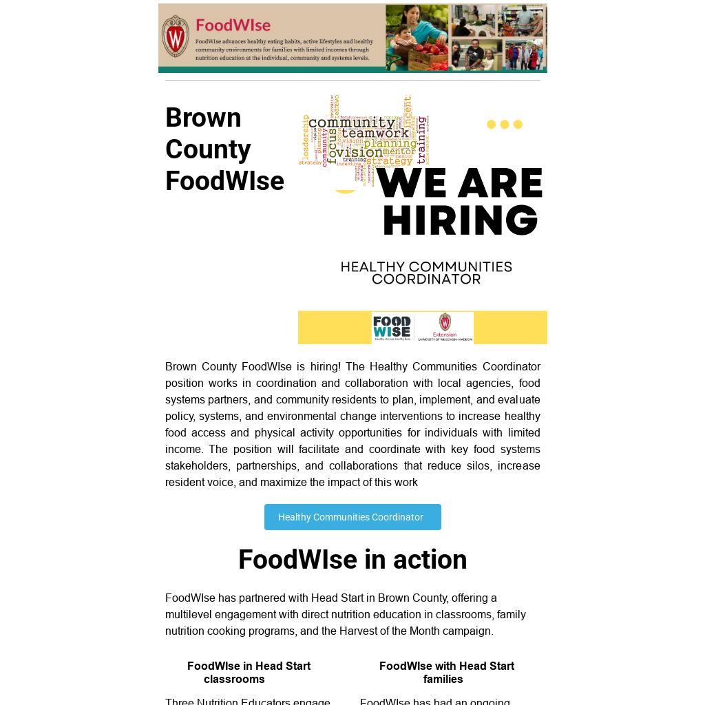 Brown County FoodWIse is hiring! The Healthy Communities Coordinator position works in coordination and collaboration with local agencies, food systems partners, and community residents to plan, implement, and evaluate policy, systems, and environmental change interventions to increase healthy food access and physical activity opportunities for individuals with limited income. The position will facilitate and coordinate with key food systems stakeholders, partnerships, and collaborations that reduce silos, increase resident voice, and maximize the impact of this work