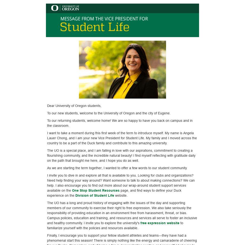 I want to take a moment during this first week of the term to introduce myself. My name is Angela Lauer Chong, and I am your new Vice President for Student Life. My family and I moved across the country to be a part of the Duck family and contribute to this amazing university.