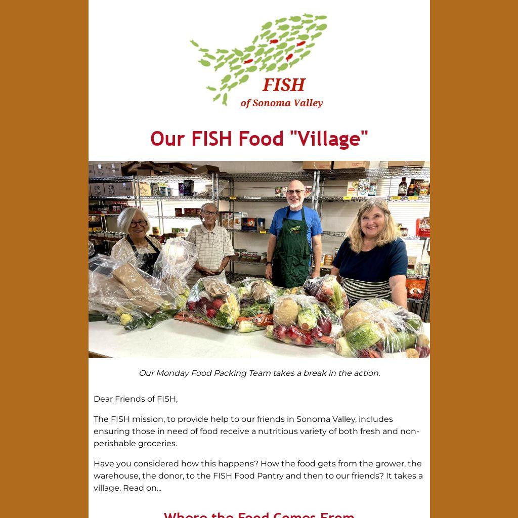The FISH mission, to provide help to our friends in Sonoma Valley, includes ensuring those in need of food receive a nutritious variety of both fresh and non-perishable groceries.