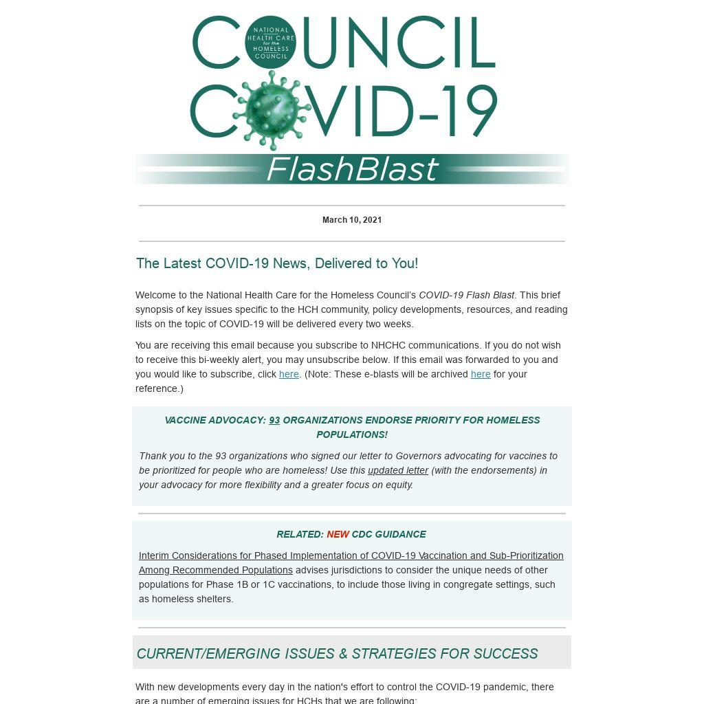 Welcome to the National Health Care for the Homeless Council’s COVID-19 Flash Blast. This brief synopsis of key issues specific to the HCH community, policy developments, resources, and reading lists on the topic of COVID-19 will be delivered every two weeks.
