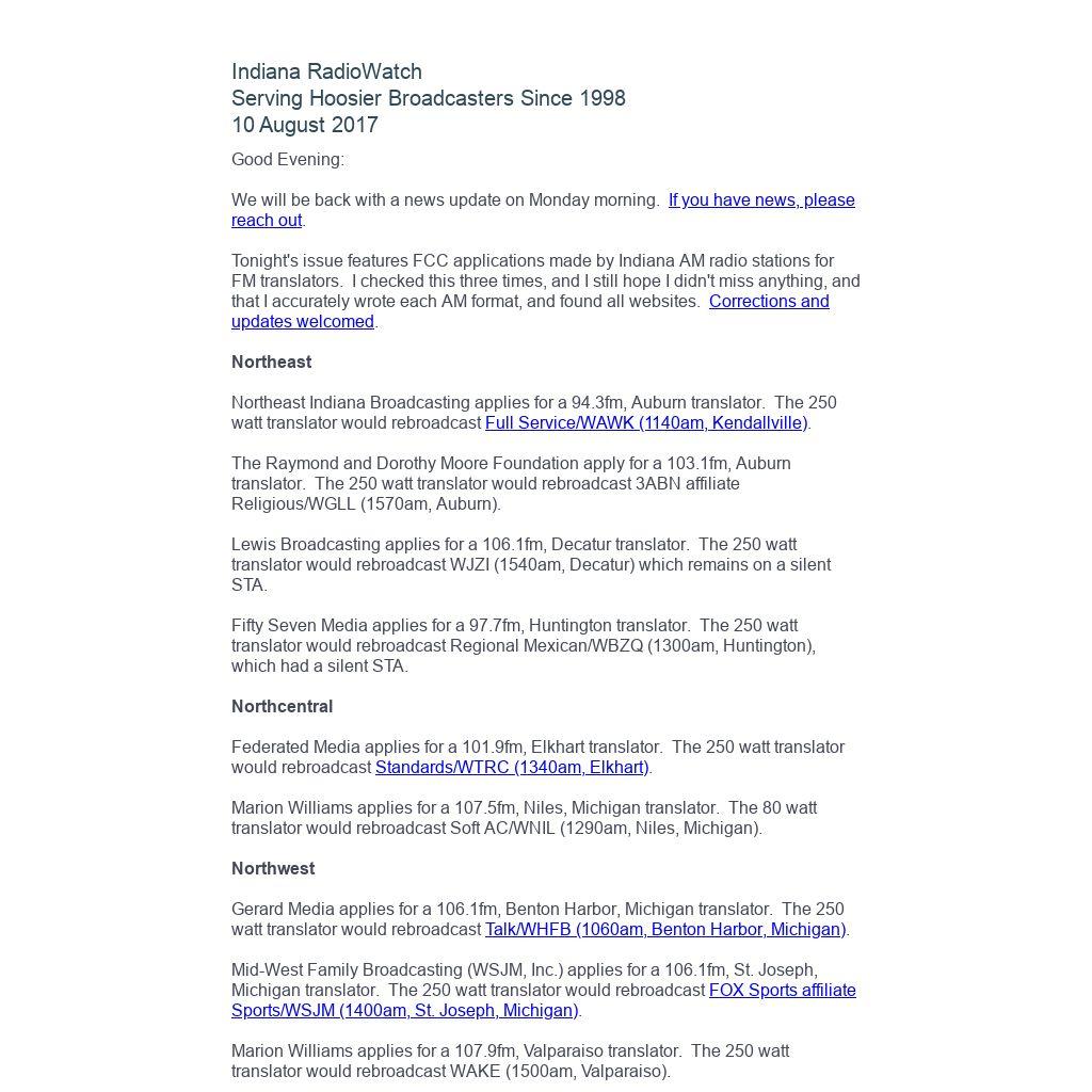 Tonight's issue features FCC applications made by Indiana AM radio stations for FM translators. I checked this three times, and I still hope I didn't miss anything, and that I accurately wrote each AM format, and found all websites. Corrections and updates welcomed.
