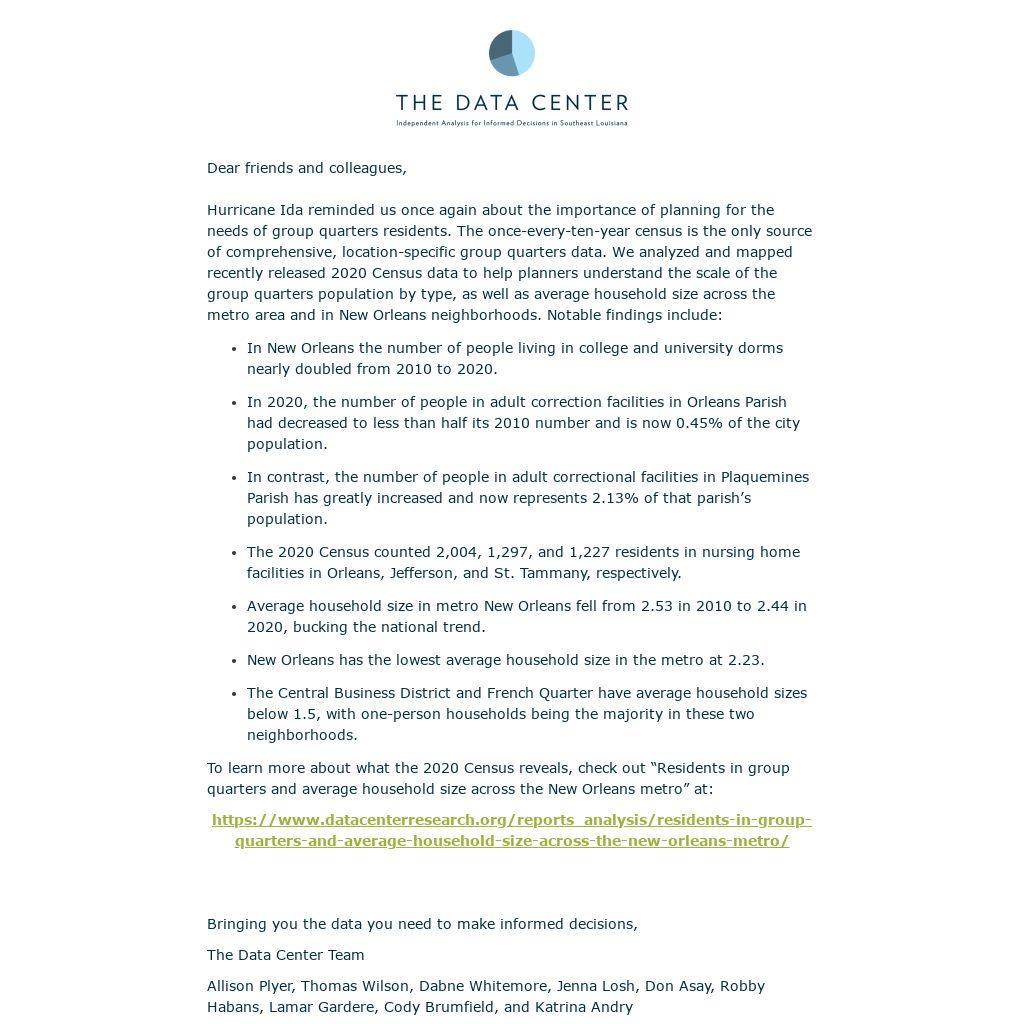 To learn more about what the 2020 Census reveals, check out “Residents in group quarters and average household size across the New Orleans metro” at: