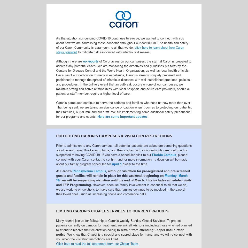 Prior to admission to any Caron campus, all potential patients are asked pre-screening questions about recent travel, flu-like symptoms, and their contact with individuals who are confirmed or suspected of having COVID-19. If you have a scheduled visit to our Florida Campus, please connect with your Caron contact to confirm and for more information - a decision will be made about our family program scheduled for April 1 closer to the time.