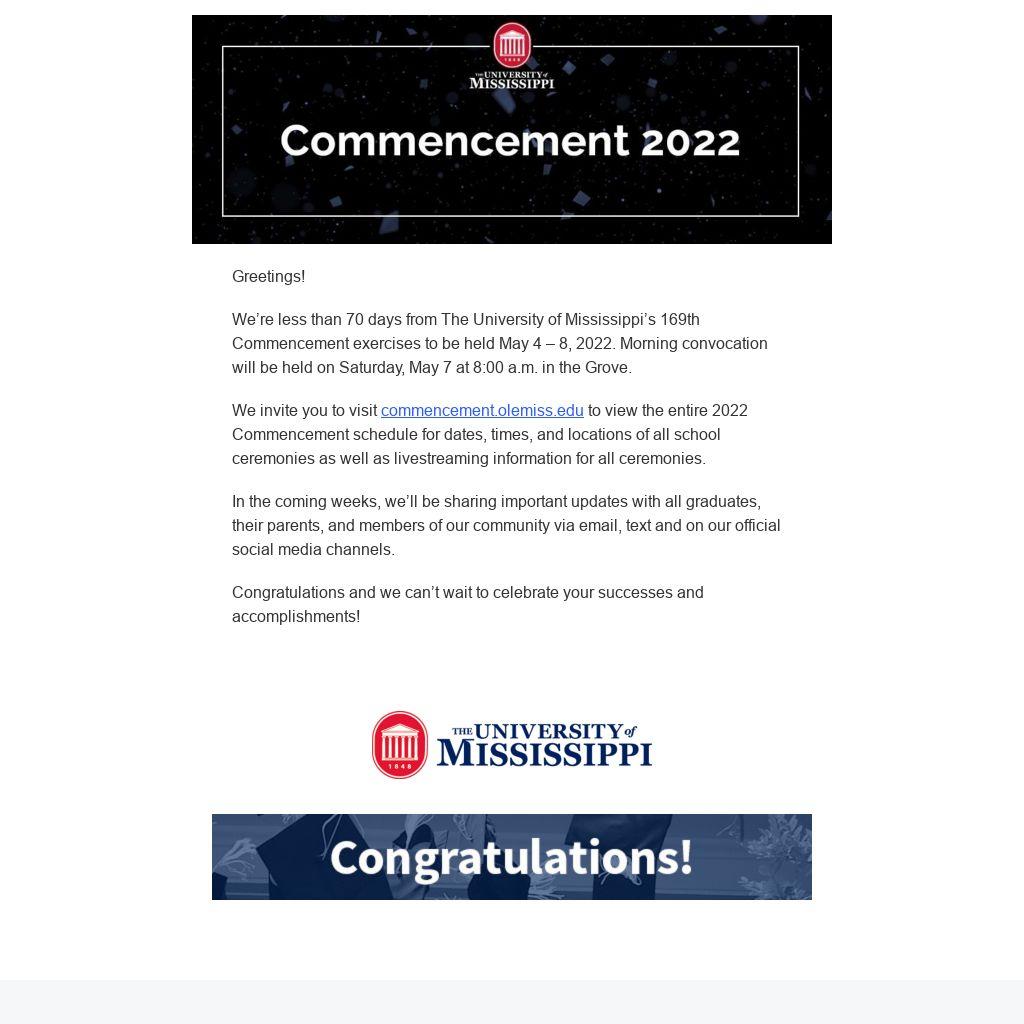 We’re less than 70 days from The University of Mississippi’s 169th Commencement exercises to be held May 4 – 8, 2022. Morning convocation will be held on Saturday, May 7 at 8:00 a.m. in the Grove.