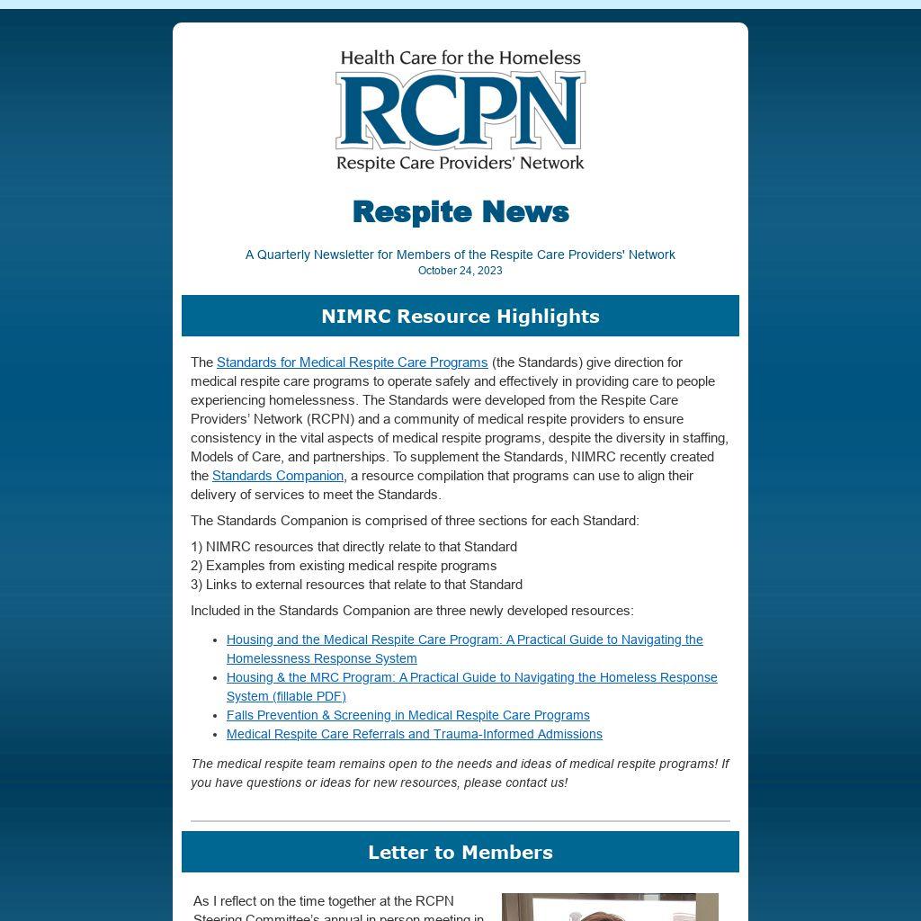 - If you are not already a member, please join the Respite Care Providers Network (RCPN). The mission of RCPN is to improve the health status of individuals who are homeless by supporting programs that provide medical respite and related services. Follow this link for more information and to join the RCPN.