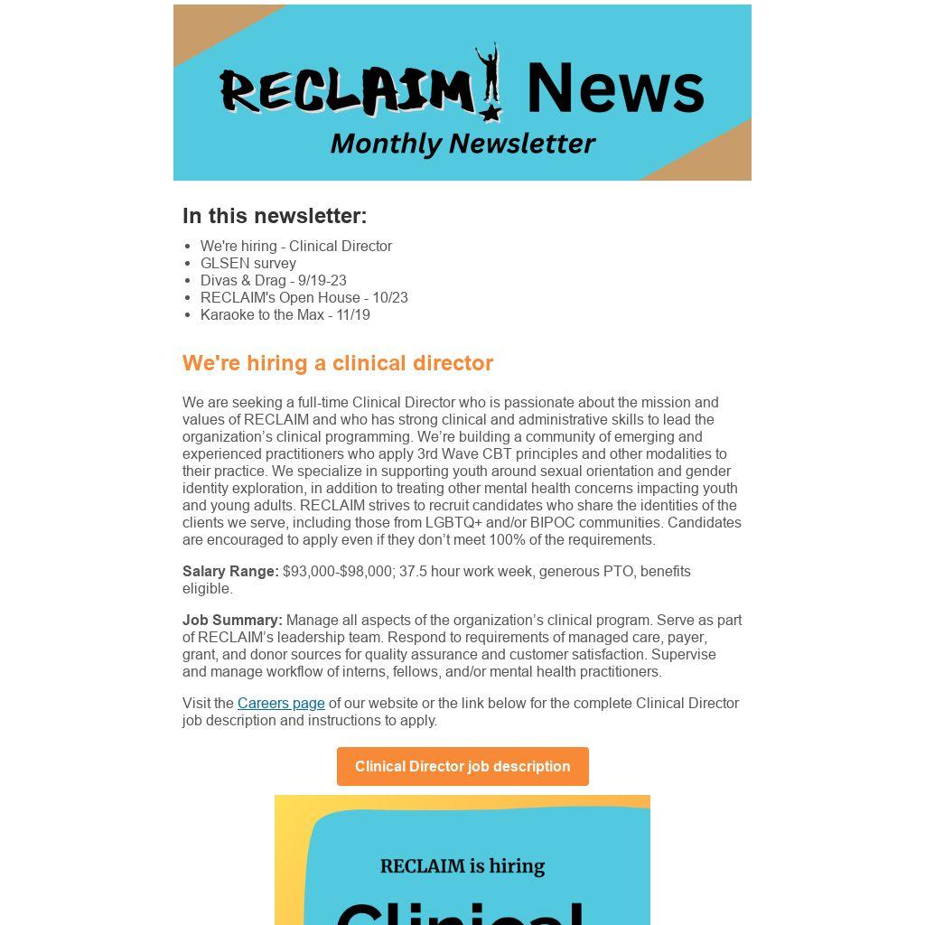 We are seeking a full-time Clinical Director who is passionate about the mission and values of RECLAIM and who has strong clinical and administrative skills to lead the organization’s clinical programming. We’re building a community of emerging and experienced practitioners who apply 3rd Wave CBT principles and other modalities to their practice. We specialize in supporting youth around sexual orientation and gender identity exploration, in addition to treating other mental health concerns impacting youth and young adults. RECLAIM strives to recruit candidates who share the identities of the clients we serve, including those from LGBTQ+ and/or BIPOC communities. Candidates are encouraged to apply even if they don’t meet 100% of the requirements.