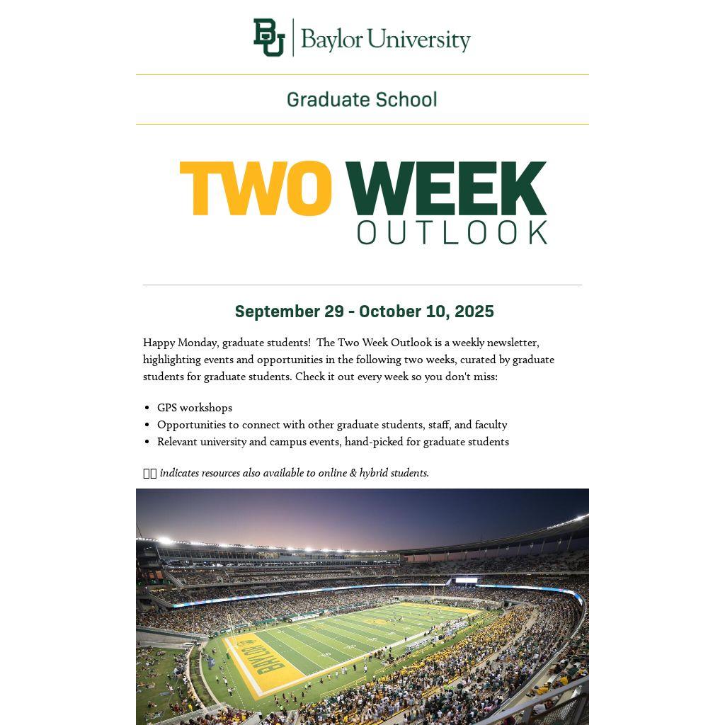 Happy Monday, graduate students! The Two Week Outlook is a weekly newsletter, highlighting events and opportunities in the following two weeks, curated by graduate students for graduate students. Check it out every week so you don't miss: