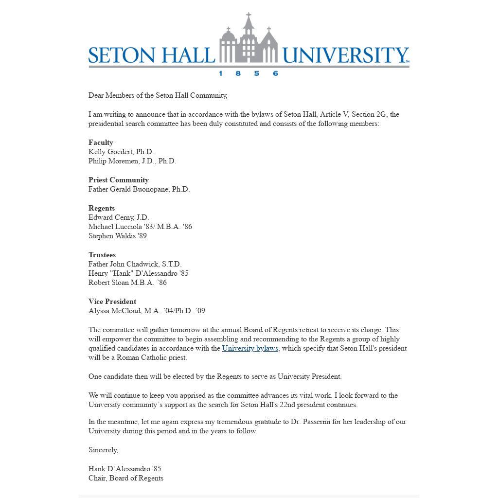 I am writing to announce that in accordance with the bylaws of Seton Hall, Article V, Section 2G, the presidential search committee has been duly constituted and consists of the following members: