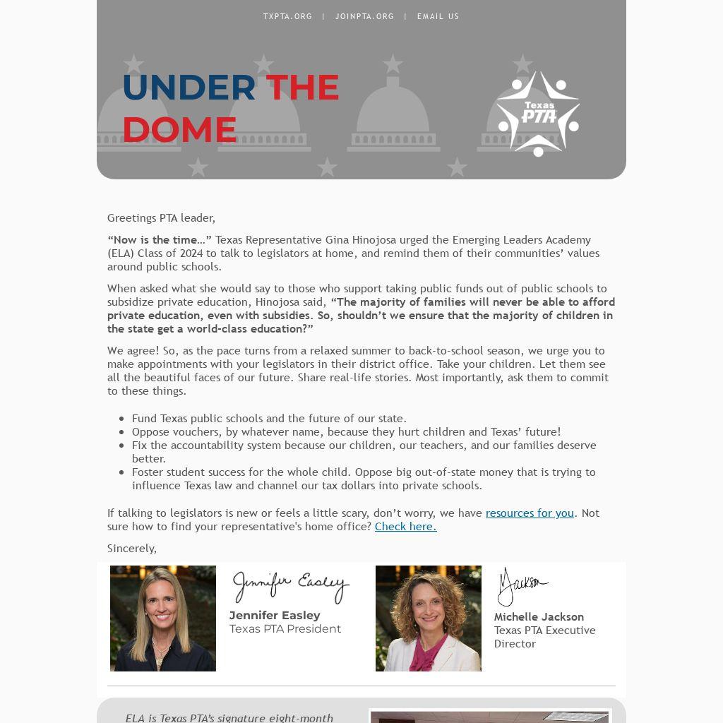 “Now is the time…” Texas Representative Gina Hinojosa urged the Emerging Leaders Academy (ELA) Class of 2024 to talk to legislators at home, and remind them of their communities’ values around public schools.
