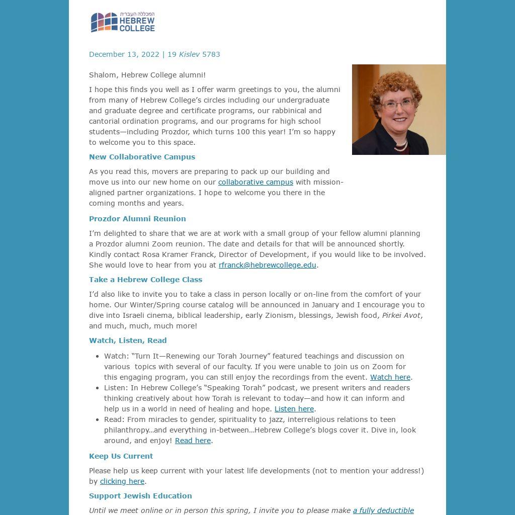 Until we meet online or in person this spring, I invite you to please make a fully deductible gift to Hebrew College before December 31, 2022 to help Jewish learning and leadership continue to thrive and flourish.