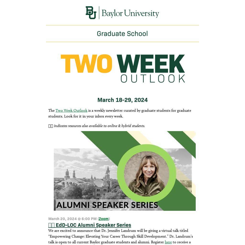 The Two Week Outlook is a weekly newsletter curated by graduate students for graduate students. Look for it in your inbox every week.