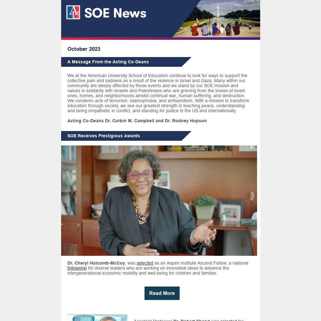 We at the American University School of Education continue to look for ways to support the collective pain and sadness as a result of the violence in Israel and Gaza. Many within our community are deeply affected by these events and we stand by our SOE mission and values in solidarity with Israelis and Palestinians who are grieving from the losses of loved ones, homes, and neighborhoods amidst continual war, human suffering, and destruction. We condemn acts of terrorism, Islamophobia, and antisemitism. With a mission to transform education through society, we see our greatest strength in teaching peace, understanding and being empathetic in conflict, and standing for justice in the US and internationally.Â
