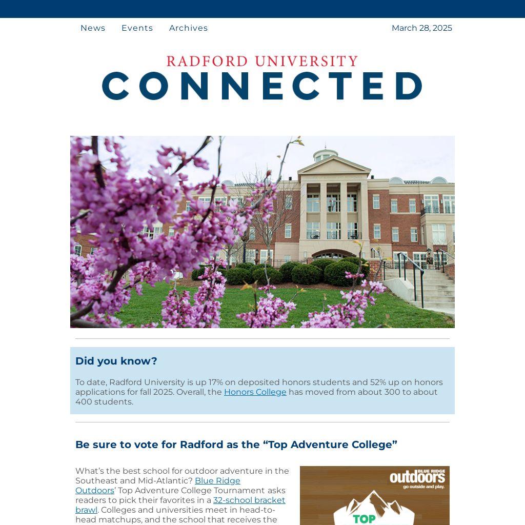 To date, Radford University is up 17% on deposited honors students and 52% up on honors applications for fall 2025. Overall, the Honors College has moved from about 300 to about 400 students.