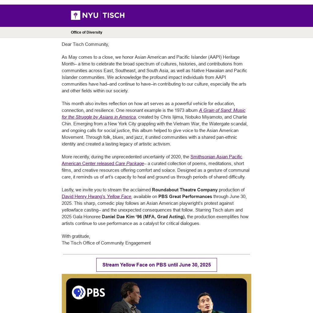 Lastly, we invite you to stream the acclaimed Roundabout Theatre Company production of David Henry Hwang’s Yellow Face, available on PBS Great Performances through June 30, 2025. This sharp, comedic play follows an Asian American playwright’s protest against yellowface casting– and the unexpected consequences that follow. Starring Tisch alum and 2025 Gala Honoree Daniel Dae Kim ‘96 (MFA, Grad Acting), the production exemplifies how artists continue to use performance as a catalyst for critical dialogues.
