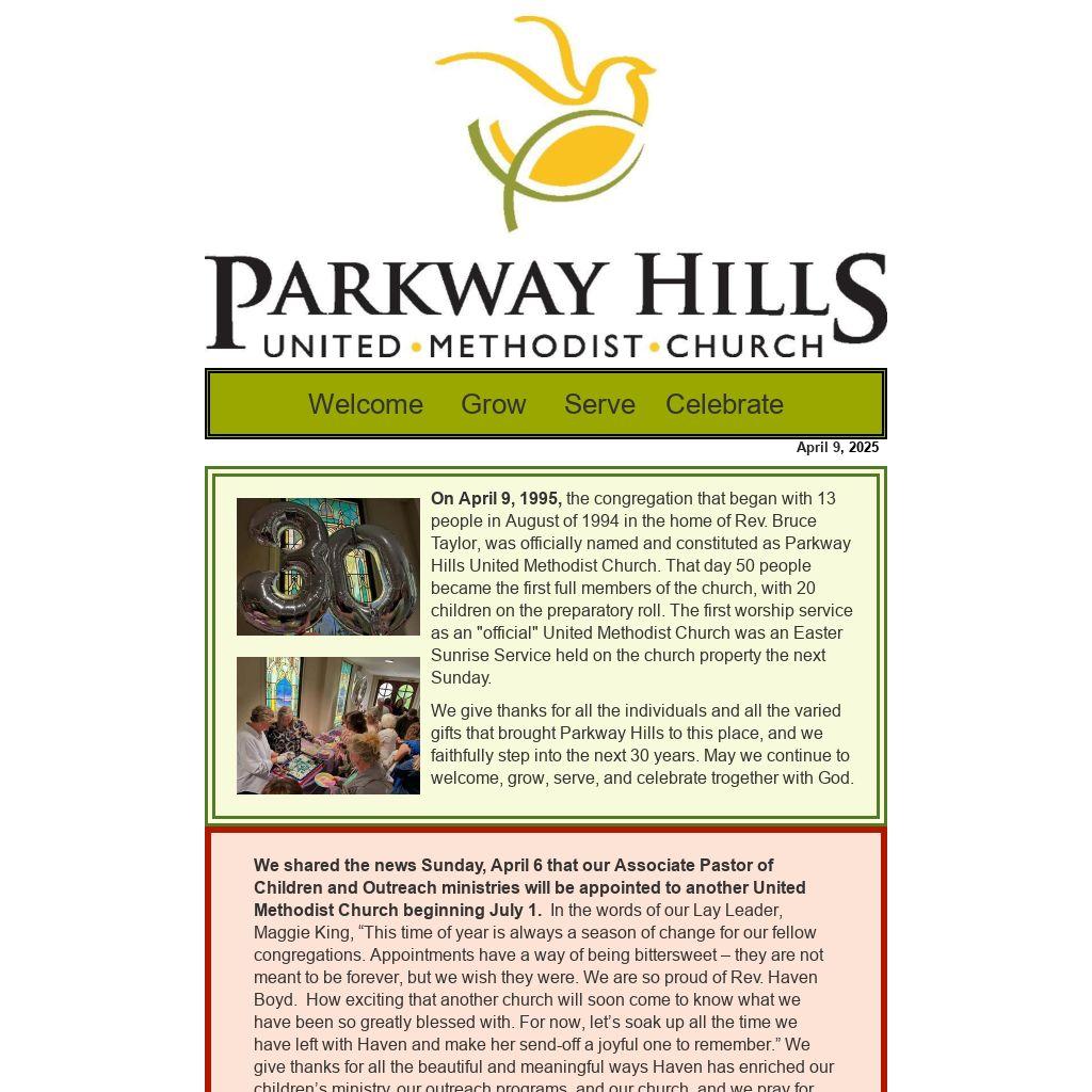 We give thanks for all the individuals and all the varied gifts that brought Parkway Hills to this place, and we faithfully step into the next 30 years. May we continue to welcome, grow, serve, and celebrate trogether with God.