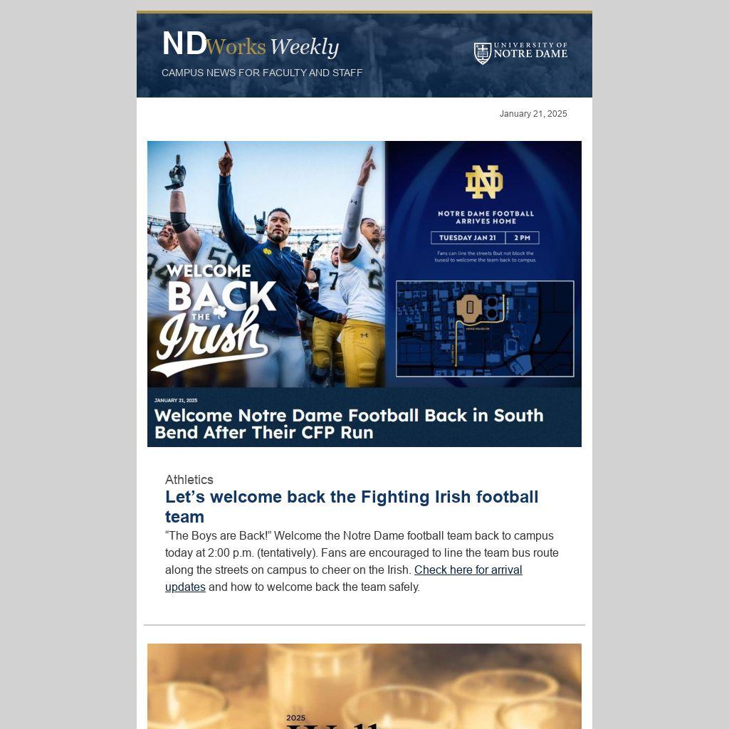 The prayer service will be followed by a candlelight march to the Sacred Heart of Jesus statue and a dessert reception in the Center for Diversity, Equity, and Inclusion in the LaFortune Student Center. All are welcome.