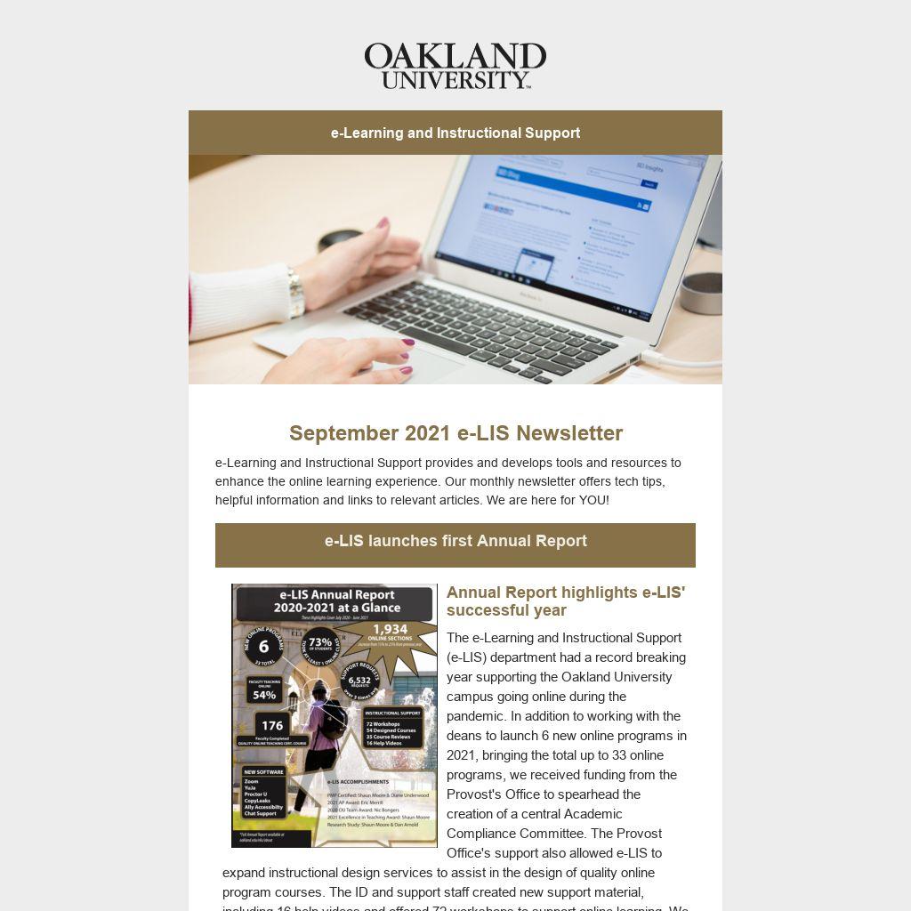 Annual Report highlights e-LIS' successful yearThe e-Learning and Instructional Support (e-LIS) department had a record breaking year supporting the Oakland University campus going online during the pandemic. In addition to working with the deans to launch 6 new online programs in 2021, bringing the total up to 33 online programs, we received funding from the Provost's Office to spearhead the creation of a central Academic Compliance Committee. The Provost Office's support also allowed e-LIS to expand instructional design services to assist in the design of quality online program courses. The ID and support staff created new support material, including 16 help videos and offered 72 workshops to support online learning. We implemented many new pieces of software. While all of this work was going on, e-LIS has its busiest year to date with nearly seven times the traditional amount of online courses and 54 percent of faculty teaching online and 74 percent of students taking at least one online class. e-LIS successfully answered more than three times the average number of support requests at 6,532. To read more about the accomplishments and see the highlights of the last year in e-LIS, see our Year in a Glance or read our complete Annual Report.