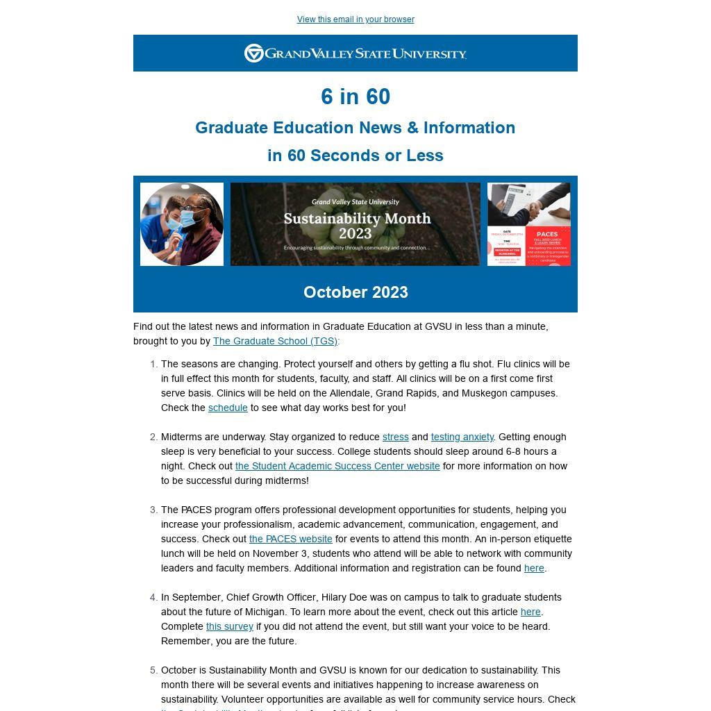 Find out the latest news and information in Graduate Education at GVSU in less than a minute, brought to you byThe Graduate School (TGS):