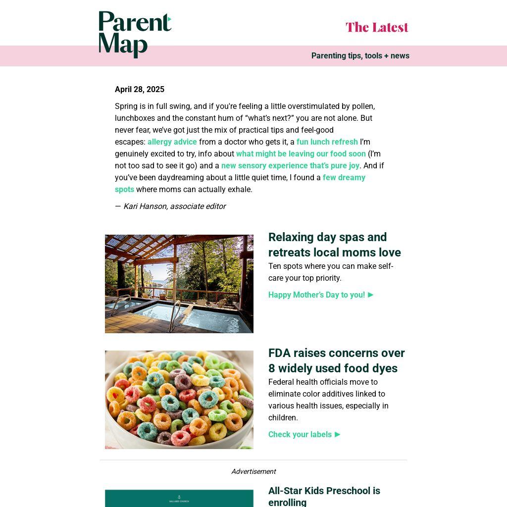 Spring is in full swing, and if you're feeling a little overstimulated by pollen, lunchboxes and the constant hum of “what’s next?” you are not alone. But never fear, we’ve got just the mix of practical tips and feel-good escapes: allergy advice from a doctor who gets it, a fun lunch refresh I’m genuinely excited to try, info about what might be leaving our food soon (I’m not too sad to see it go) and a new sensory experience that’s pure joy. And if you’ve been daydreaming about a little quiet time, I found a few dreamy spots where moms can actually exhale.Â