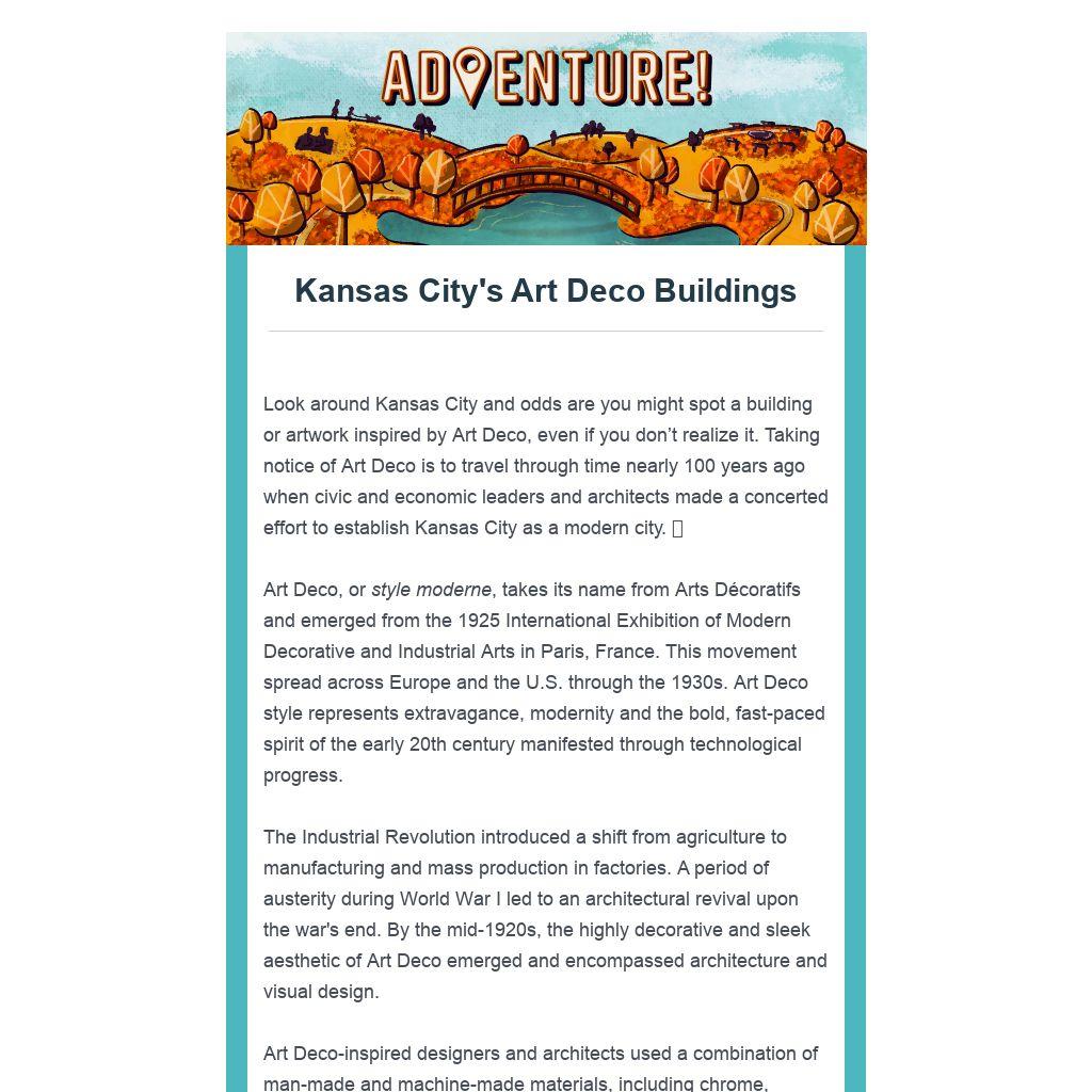 Look around Kansas City and odds are you might spot a building or artwork inspired by Art Deco, even if you donāt realize it. Taking notice of Art Deco is to travel through time nearly 100 years ago when civic and economic leaders and architects made a concerted effort to establish Kansas City as a modern city.Ā š