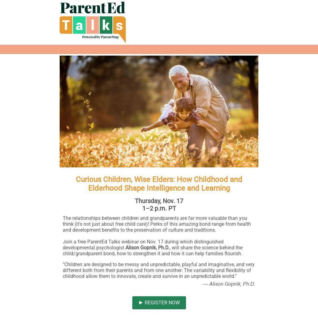 Join a free ParentEd Talks webinar on Nov. 17 during which distinguished developmental psychologist Alison Gopnik, Ph.D., will share the science behind the child/grandparent bond, how to strengthen it and how it can help families flourish.