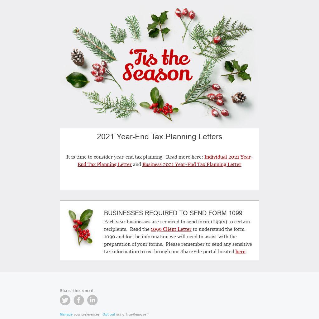 Each year businesses are required to send form 1099(s) to certain recipients. Read the 1099 Client Letter to understand the form 1099 and for the information we will need to assist with the preparation of your forms. Please remember to send any sensitive tax information to us through our ShareFile portal located here.