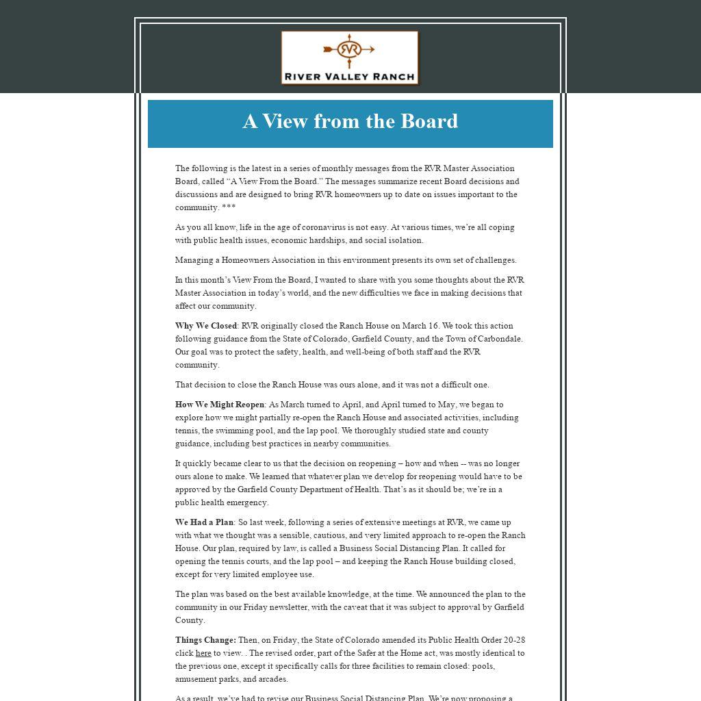 The following is the latest in a series of monthly messages from the RVR Master Association Board, called “A View From the Board.” The messages summarize recent Board decisions and discussions and are designed to bring RVR homeowners up to date on issues important to the community. ***