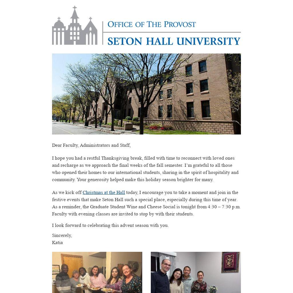 As we kick off Christmas at the Hall today, I encourage you to take a moment and join in the festive events that make Seton Hall such a special place, especially during this time of year. As a reminder, the Graduate Student Wine and Cheese Social is tonight from 4:30 – 7:30 p.m. Faculty with evening classes are invited to stop by with their students.