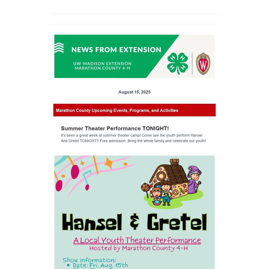 It's been a great week at summer theater camp! Come see the youth perform Hansel And Gretel TONIGHT!! Free admission. Bring the whole family and celebrate our youth!