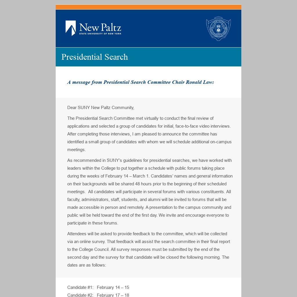 As recommended in SUNY’s guidelines for presidential searches, we have worked with leaders within the College to put together a schedule with public forums taking place during the weeks of February 14 – March 1. Candidates’ names and general information on their backgrounds will be shared 48 hours prior to the beginning of their scheduled meetings. All candidates will participate in several forums with various constituents. All faculty, administrators, staff, students, and alumni will be invited to forums that will be made accessible in person and remotely. A presentation to the campus community and public will be held toward the end of the first day. We invite and encourage everyone to participate in these forums.