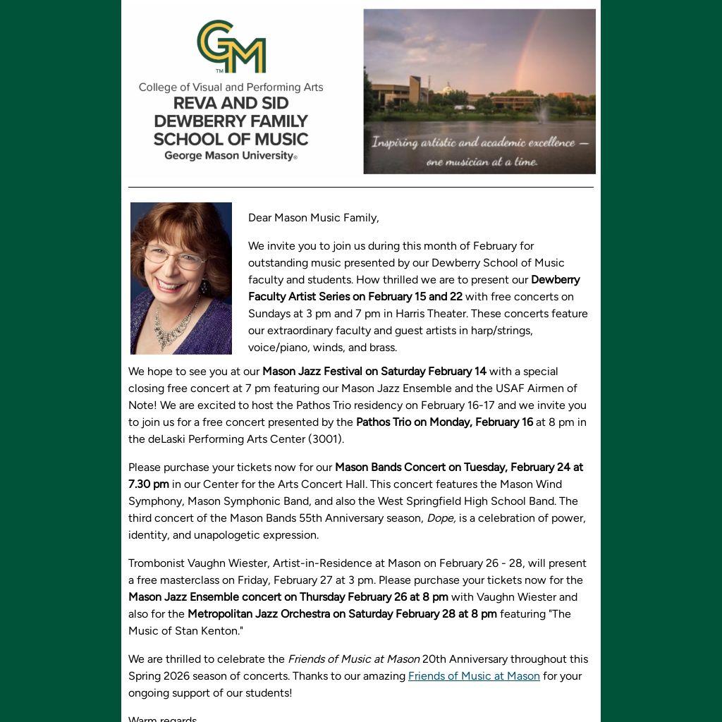 We are thrilled to celebrate the Friends of Music at Mason 20th Anniversary throughout this Spring 2026 season of concerts. Thanks to our amazing Friends of Music at Mason for your ongoing support of our students!