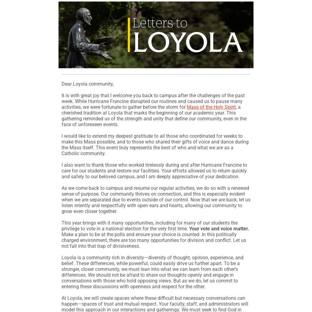 It is with great joy that I welcome you back to campus after the challenges of the past week. While Hurricane Francine disrupted our routines and caused us to pause many activities, we were fortunate to gather before the storm for Mass of the Holy Spirit, a cherished tradition at Loyola that marks the beginning of our academic year. This gathering reminded us of the strength and unity that define our community, even in the face of unforeseen events.