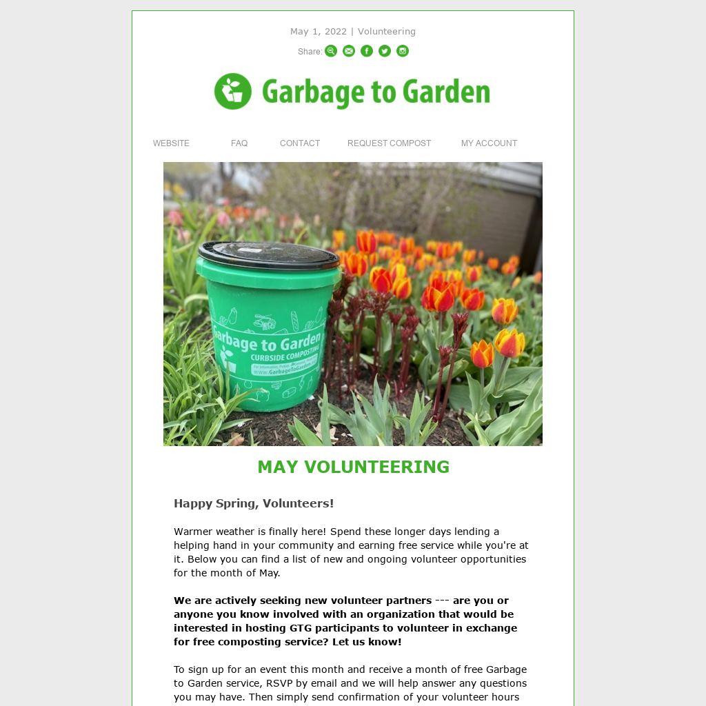 To sign up for an event this month and receive a month of free Garbage to Garden service, RSVP by email and we will help answer any questions you may have. Then simply send confirmation of your volunteer hours to volunteer@garbagetogarden.org to receive credit. Remember, events are first-come, first-serve.