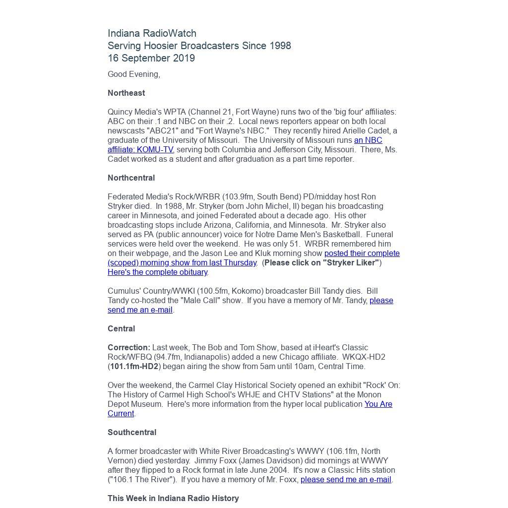 Indiana RadioWatch subscriptions are free. To subscribe, send an e-mail to irw@well.com and we'll add you. After publication, we archive Indiana RadioWatch on the Indiana Radio Archive at indianaradio.net. Please e-mail us your news stories and employment opportunities.