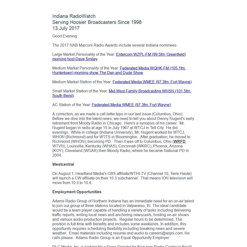 Indiana RadioWatch subscriptions are free. To subscribe, send an e-mail to irw@well.com and we'll add you. After publication, we archive Indiana RadioWatch on the Indiana Radio Archive at http://www.indianaradio.net. Please e-mail us your news stories and employment opportunities.