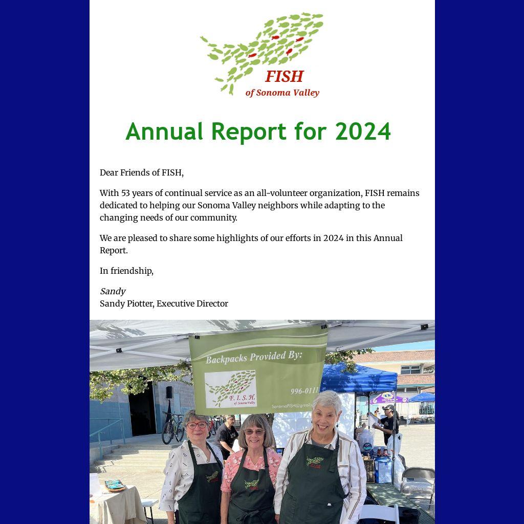 With the community's continued support, FISH is committed to our mission of lending a hand to our neighbors in need through essential safety net services. In delivering these services, we are guided by our core values of Trust, Inclusion, Responsiveness, and the Strength of Volunteers. As we move into the new year, we embrace the community spirit that unites us as Friends In Sonoma Helping.