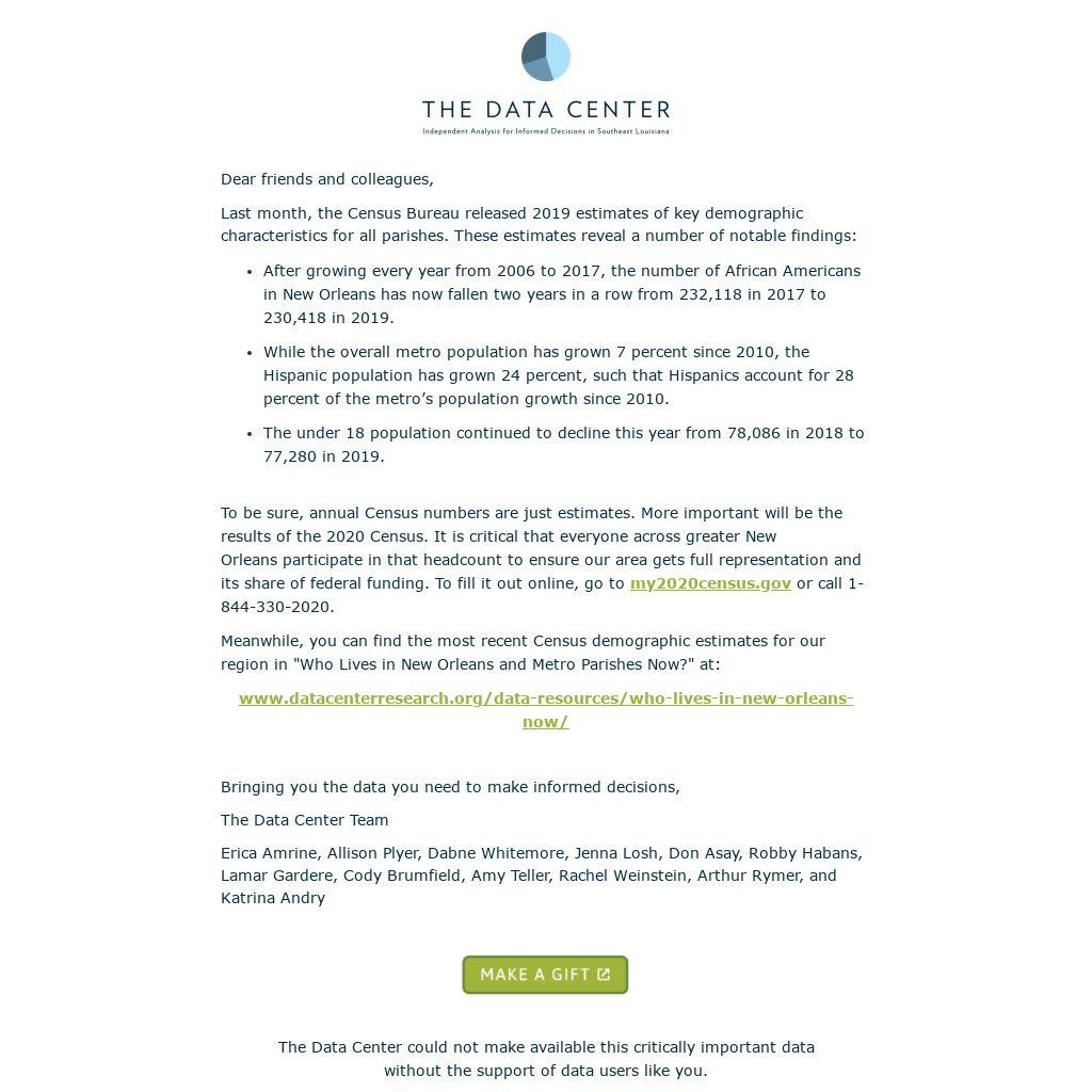 To be sure, annual Census numbers are just estimates. More important will be the results of the 2020 Census. It is critical that everyone across greater New Orleans participate in that headcount to ensure our area gets full representation and its share of federal funding. To fill it out online, go to my2020census.gov or call 1-844-330-2020.