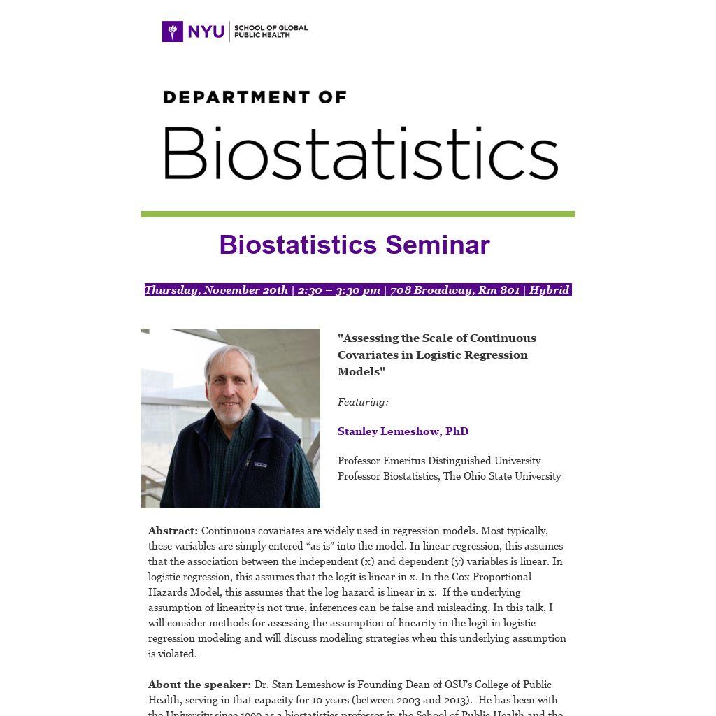 About the speaker: Dr. Stan Lemeshow is Founding Dean of OSU's College of Public Health, serving in that capacity for 10 years (between 2003 and 2013). He has been with the University since 1999 as a biostatistics professor in the School of Public Health and the Department of Statistics, director of the biostatistics core of the Comprehensive Cancer Center and Director of the University’s Center for Biostatistics. His biostatistics research includes statistical modeling of medical data, sampling, health disparities and cancer prevention. He has published extensively in the applied and methodological literature and has co-authored three textbooks in the John Wiley & Sons Wiley statistics series, a leading publisher for the scientific, technical and medical communities worldwide. The textbooks he authored are: Applied Logistic Regression, (now in its 3rd edition), Applied Survival Analysis (now in its 2nd edition) and Sampling of Populations; Methods and Applications (now in its 4th edition). In 2003, Dr. Lemeshow was awarded the Wiley Lifetime Award. Professor Lemeshow maintains an ongoing relationship with Aarhus University, Denmark as an Honorary Professor in Biostatistics and is a member of the faculty of the Erasmus Summer Program, Rotterdam, Holland. He has taught more than 100 short courses on biostatistical methods in this country and abroad, including eight European countries, Australia, China and India.