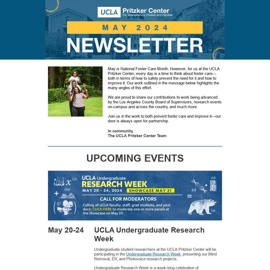 May is National Foster Care Month. However, for us at the UCLA Pritzker Center, every day is a time to think about foster care—both in terms of how to safely prevent the need for it and how to improve it. Our work outlined in the message below highlights the many angles of this effort.