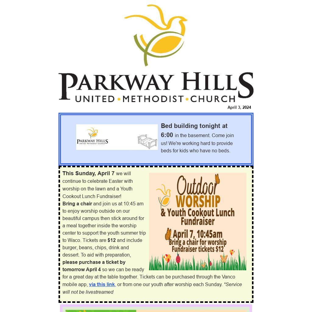 Outdoor Worship and Youth Fundraiser cookout 10:45 am. Bring your chairs!